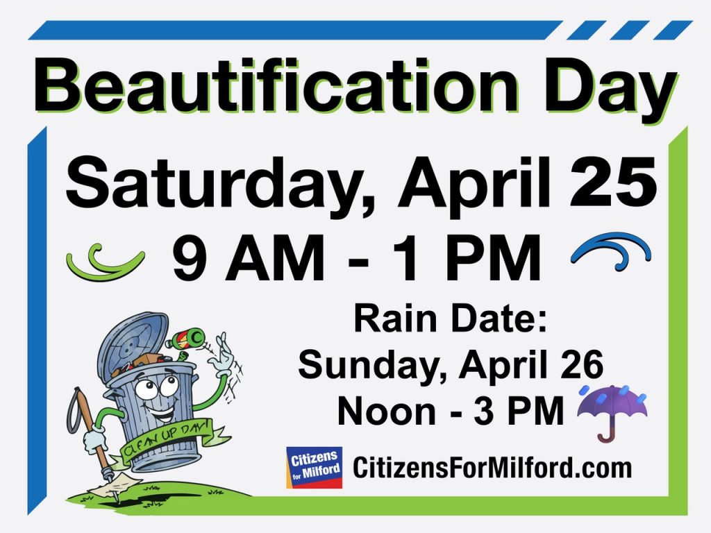 Milford Beautification Day will be held Saturday, April 25th from 9:00 a.m. to 1:00 p.m. with a rain date of Sunday, April 26th from noon to 3:00 p.m. All interested citizens are invited to meet with organizers anytime between those hours in the municipal parking lot across from Sacred Heart Church (5 East Main Street) to get supplies, instructions, and assignments.